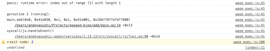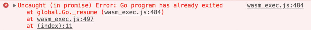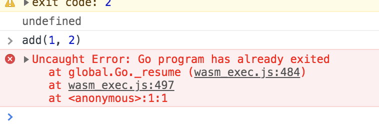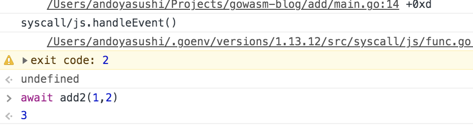 WebAssembly.instantiate()は非同期なので、add()関数を直接使用するのではなく、ラップした非同期のadd2()関数を使用しました add2()では例外発生時に、modを使用してWebAssembly.instantiate()を呼び出し、再度instを設定、go.run(inst)でアプリケーションを再起動します- JSの例外はGo側でpanicしたときに吐かれるのではなく、そのときはログを吐いて通常終了し、次回Go側のコードが呼び出されるときに件の「Goプログラムはすでに終了しています」が出ます。そのため、