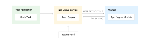 Task Queue の push queue を利用していて、以下のようにタスクが Task Queue に登録されワーカーがタスクを処理してくれます。