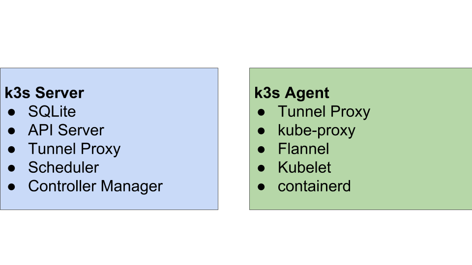 k3sは下記の図のような構成になっており、k3s Serverがkubernetes masterに、k3s Agentがkubernetes nodeに相当するようになっています。