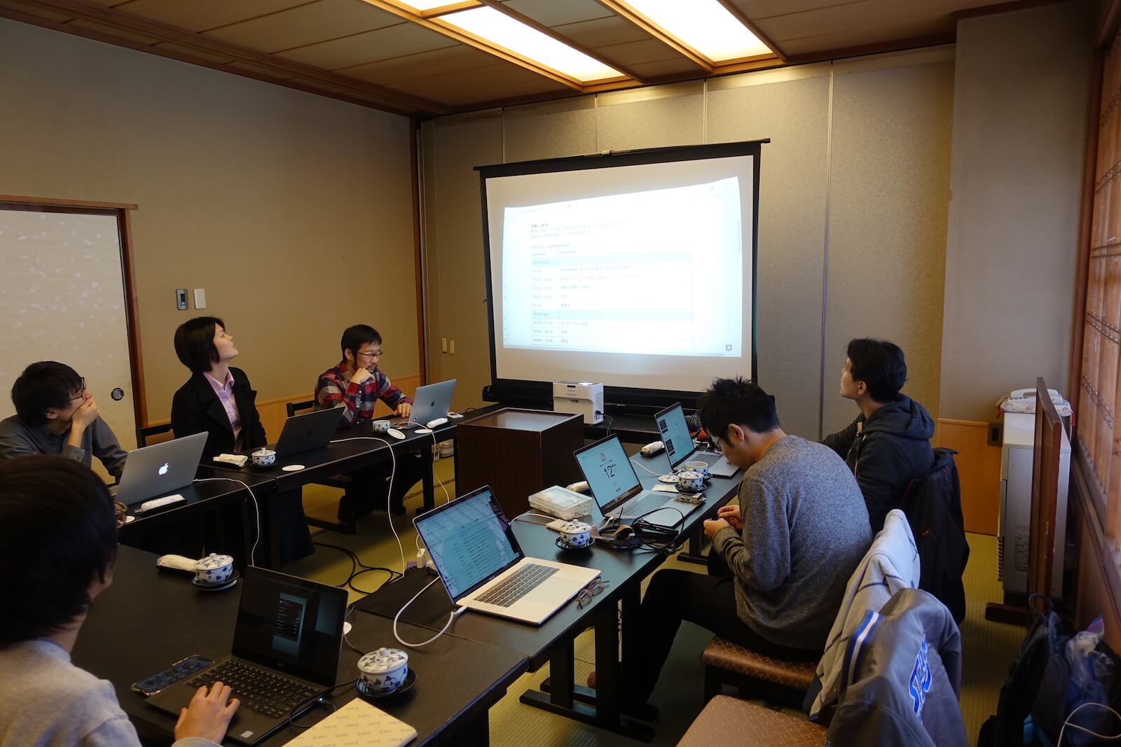 開発環境としてはWiFi、電源延長ケーブル、プロジェクタースクリーン(プロジェクタはレンタル出来ますが我々は持ち込み)があり、宴会場として使われているであろう小部屋を会議室形体(机と椅子)にして下さっていて使いやすかったです。