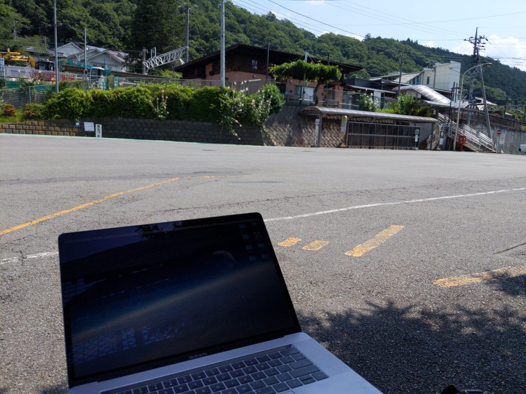木陰でMacを開いて開発環境の準備をする風景。右前方が駅舎。