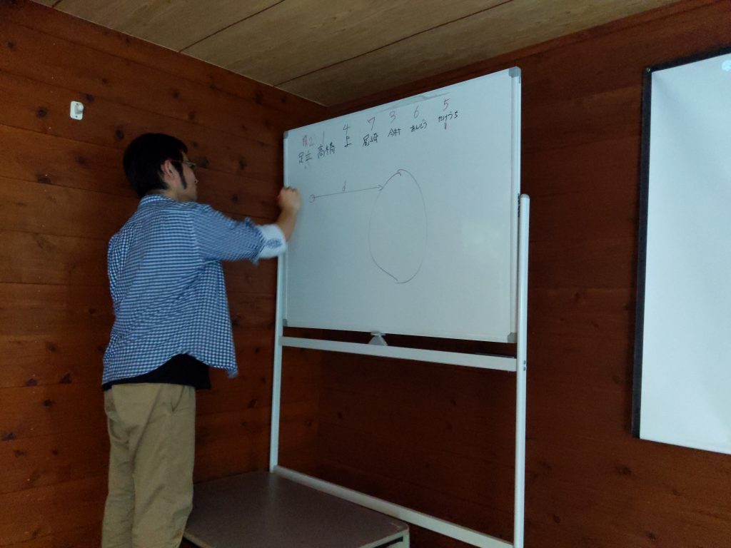ホワイトボードで恒例の「明日の発表順」をあみだくじで決めます。意外と盛り上がるw