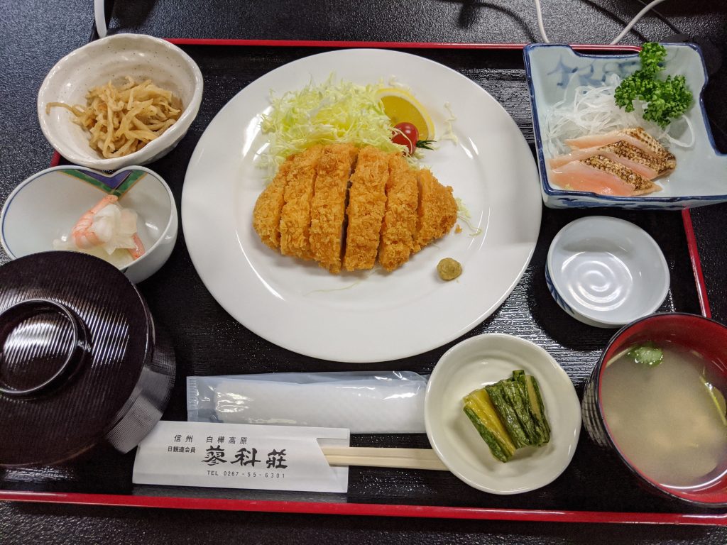 トンカツ、ニジマスのお刺身、小鉢とボリュームも申し分なし。