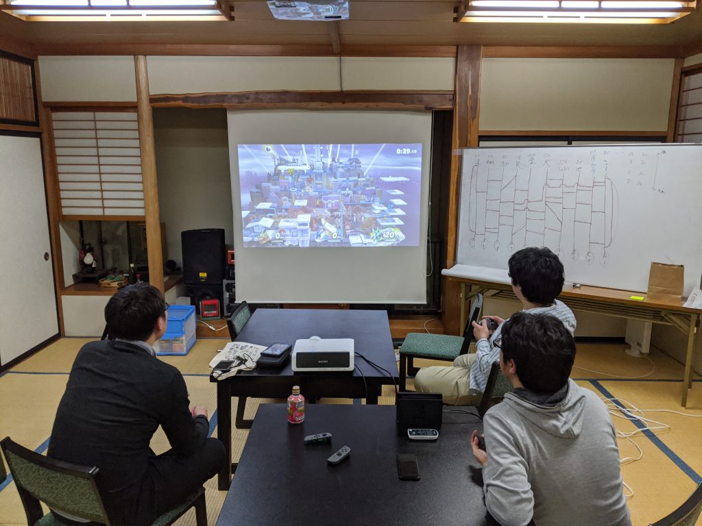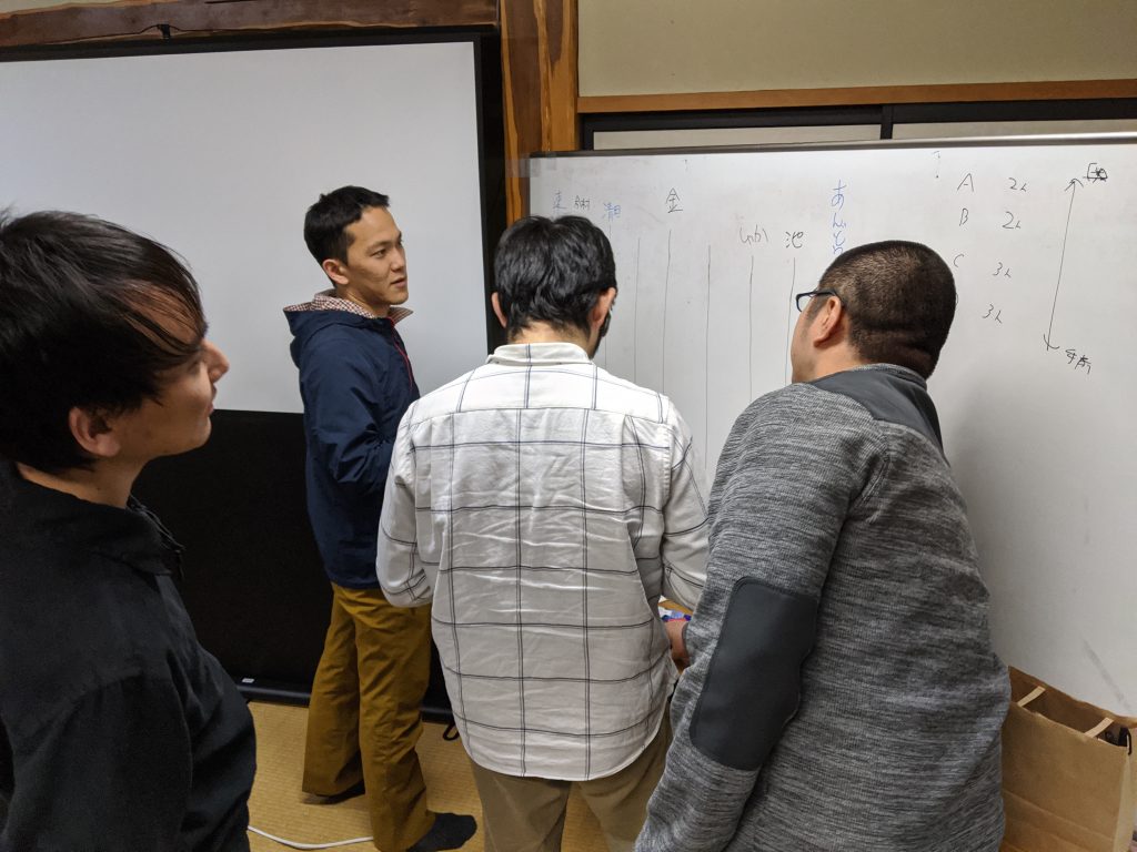 ホワイトボードで恒例の「明日の発表順」と「部屋割り」をあみだくじで決めます。これ意外と盛り上がるんですってw