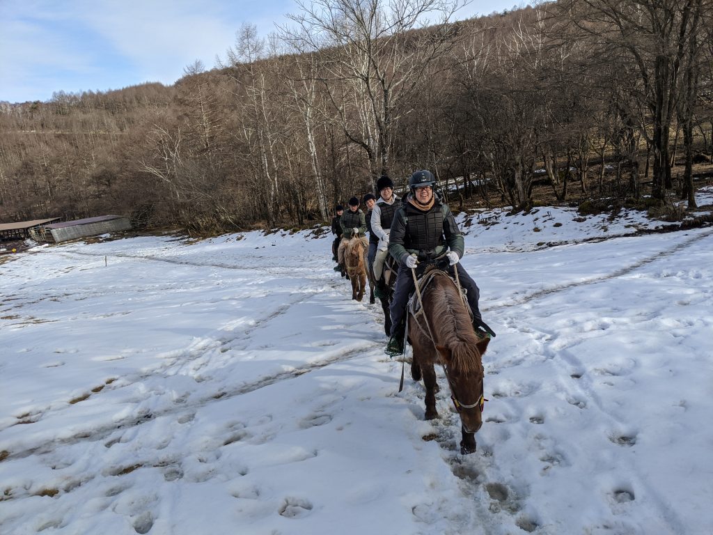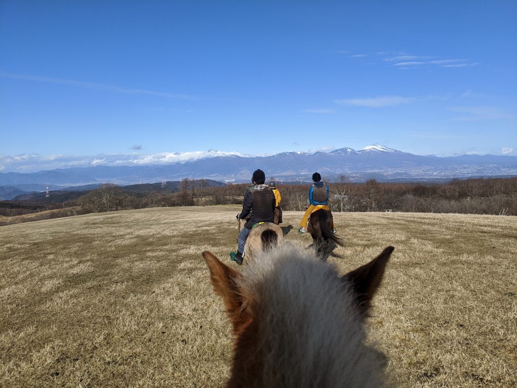 今年は暖冬のため雪が少ない点は残念ですが、気持ちの良い快晴と素晴らしい眺望で楽しく乗馬できました。