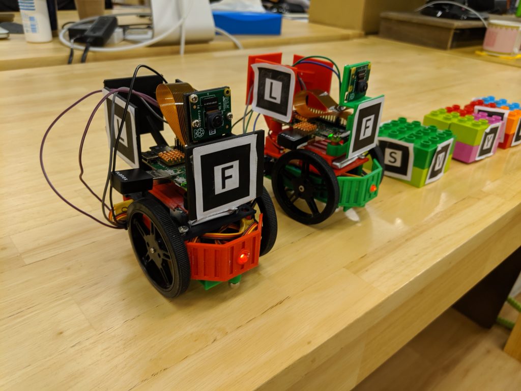 Raspberry Piにはタイヤを動かすための2つのサーボと、ラズパイカメラ、またサーボ、Raspberry Pi自体を動かすためのリチウムイオン電池が2つ接続されており、その他電圧変換基盤やスイッチなどがついています。筐体は弊社の生産部が設計しており、それを社内の3Dプリンタで出力しています。筐体に対して、AR表示させるためのARマーカを貼り付け、 「ガンメン」の表示を行っています。