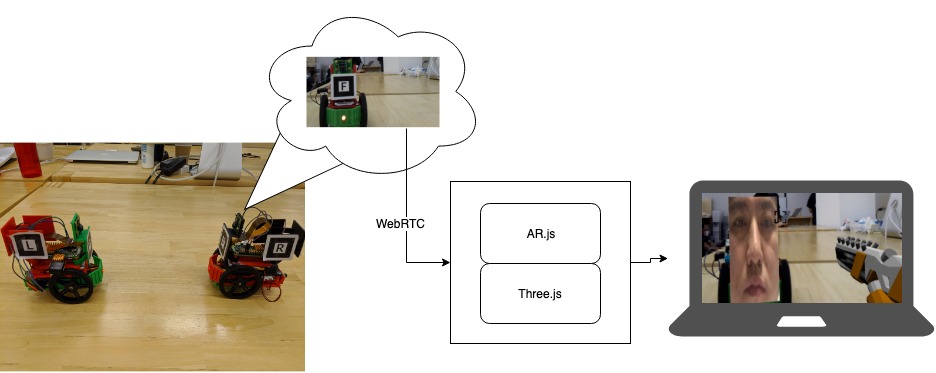Frontendは後述のロボットがラズパイカメラでwebrtcによってストリーム配信した映像を受け取り、AR.jsとThree.jsにて「ガンメン」をAR表示します。