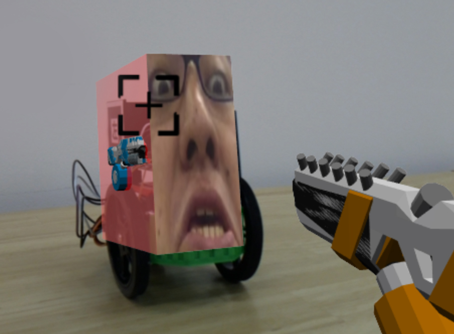 ロボットにはARマーカーが貼り付けられており、ディスプレイを通してロボットを見ると、ロボット部分に対戦相手の顔がAR表示されます。