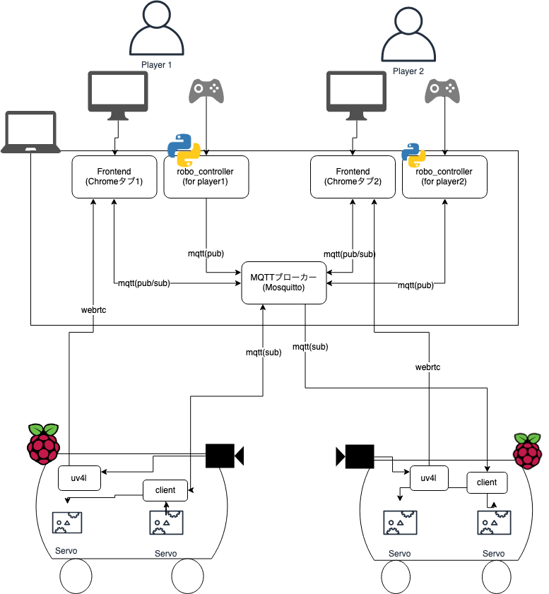 基本的にすべてゲームに関わる情報・状態の通信はMQTTにて行います。 FrontendはAngularにて作成されたフロントエンドアプリケーションです。