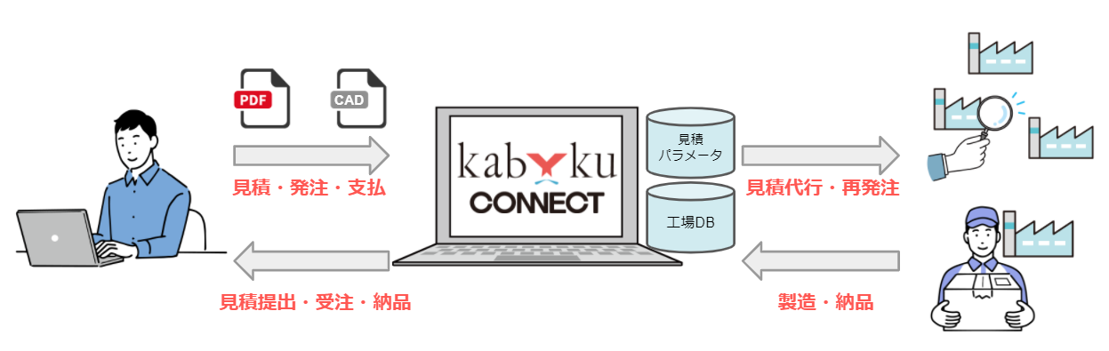 それぞれの製造事業者の対応範囲や得意な領域を可視化した工場データベースと、製造事業者ごとの見積りを再現可能な独自の見積システムにより、最適なマッチングと正確な見積代行を行うことで、製造事業者の営業活動や見積業務を支援し、製造事業者の強みを活かした取引機会を創出します。