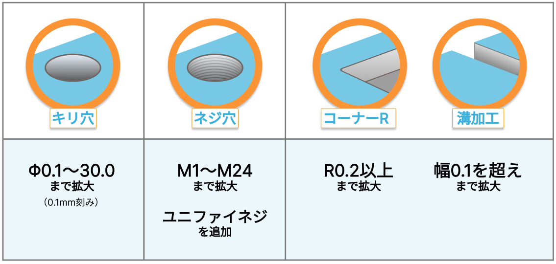 併せて、サイズの小さいコーナーRやポケット形状、細い溝加工など、小径の工具(ドリル・エンドミル・タップ)を用いて行われる加工についても対応範囲を拡大しました。