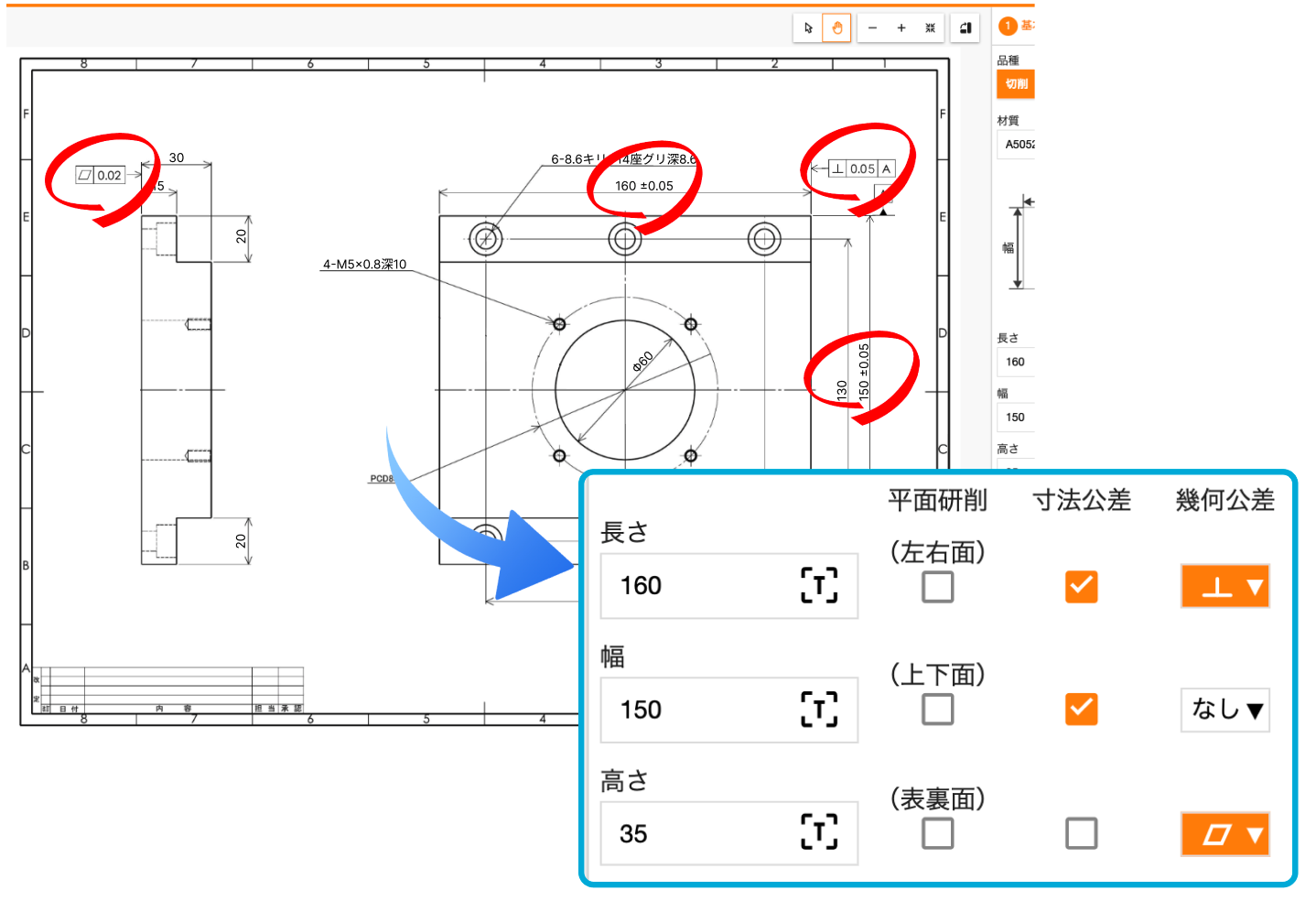 今回のアップデートでは、外形に研削指示がなく、「寸法公差」や「幾何公差」のみが指示されている製品においても原価算出が可能になりました。材料サイズ入力画面で「寸法公差」項目へのチェック、「幾何公差」の種類の選択を行うだけで、簡単にご指定いただけます。
