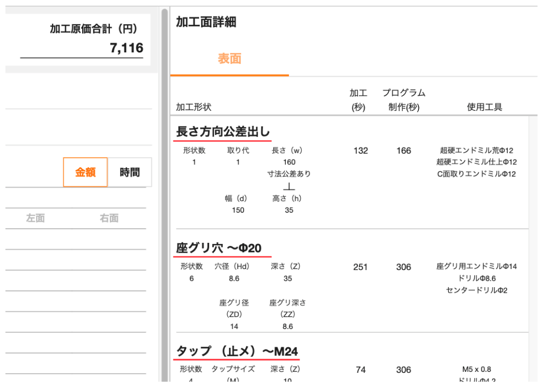 1.外形公差の加工を行う際に、同じ段取りで加工できる穴や溝などの形状があれば同時に行う等、時間効率を自動で考慮し加工費を算出いたします。