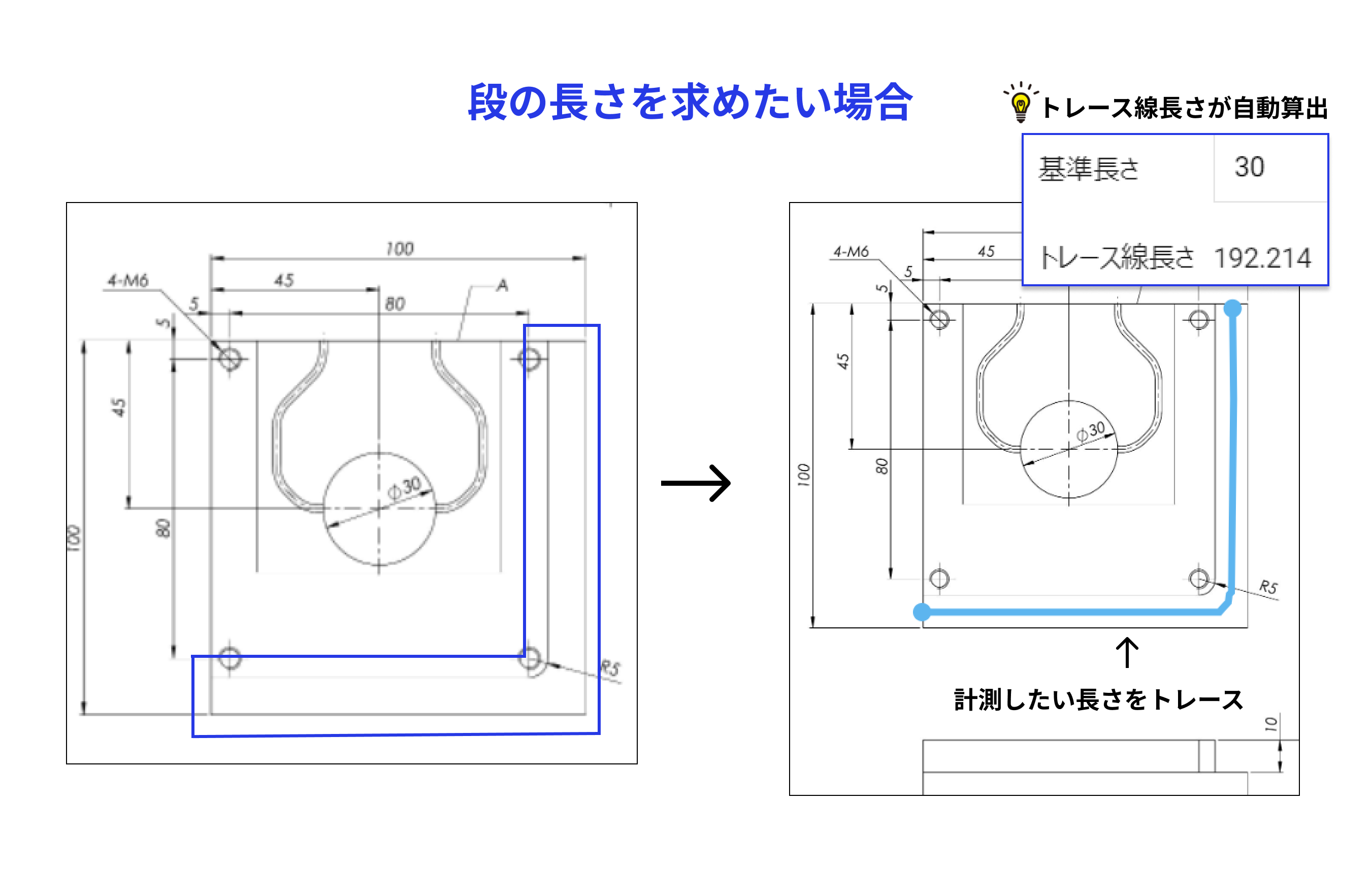 今回の機能追加では、ワイヤーカットの自由曲線の長さを計測する際に好評のトレース計測機能(図面上に寸法値の記載がない形状をなぞるだけで、長さを計測できる機能)を、段・溝などの加工形状の選択時においても使用できるようになりました。(ワイヤーカットのトレース計測機能の詳細についてはこちら)