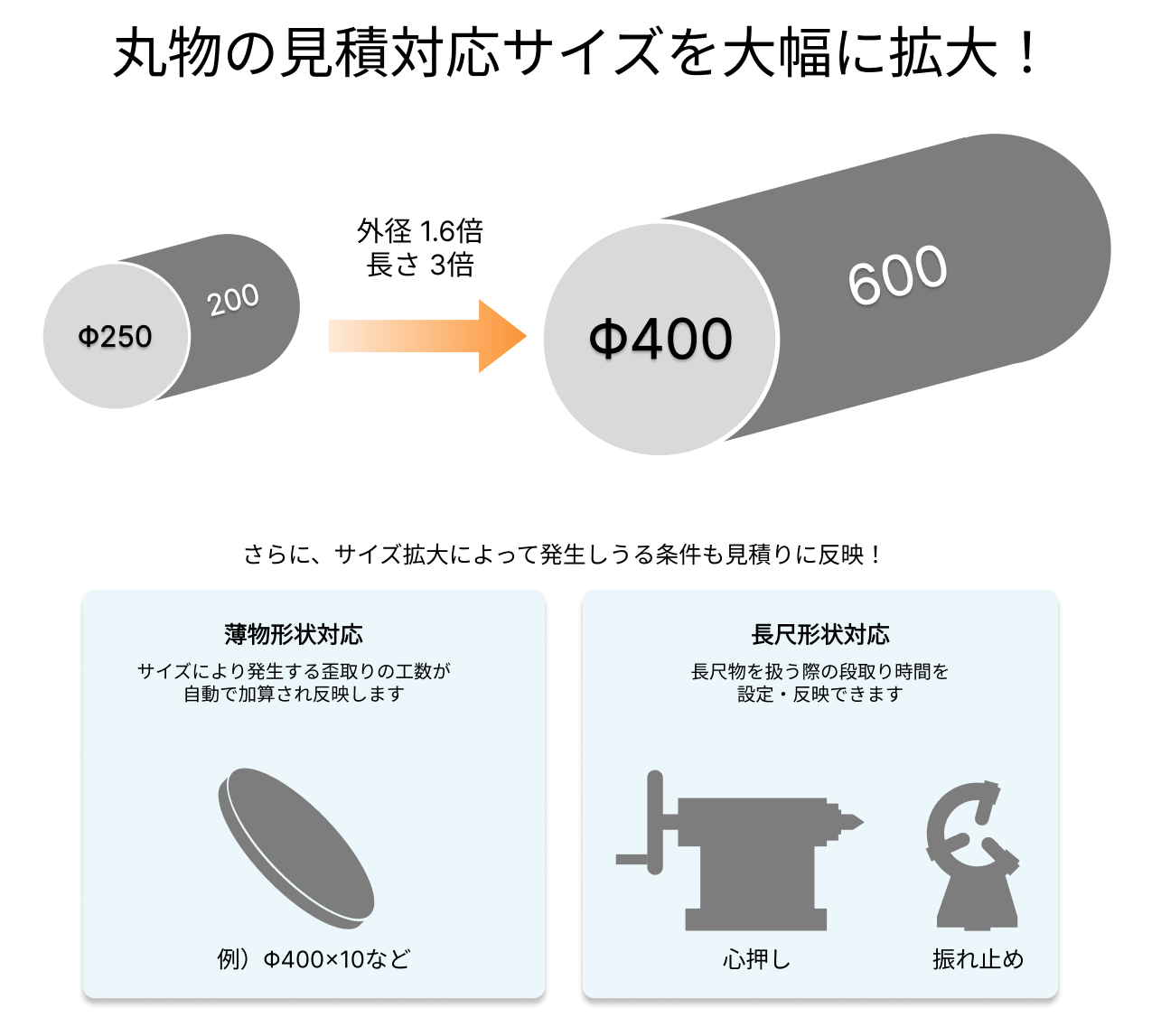 サイズを拡大したことにより「薄物形状の歪取り工程」「長尺形状の心押し・振れ止め」など新たに考慮が必要になる段取り工数も見積時の条件として指定可能になり、見積金額に反映いただけます。