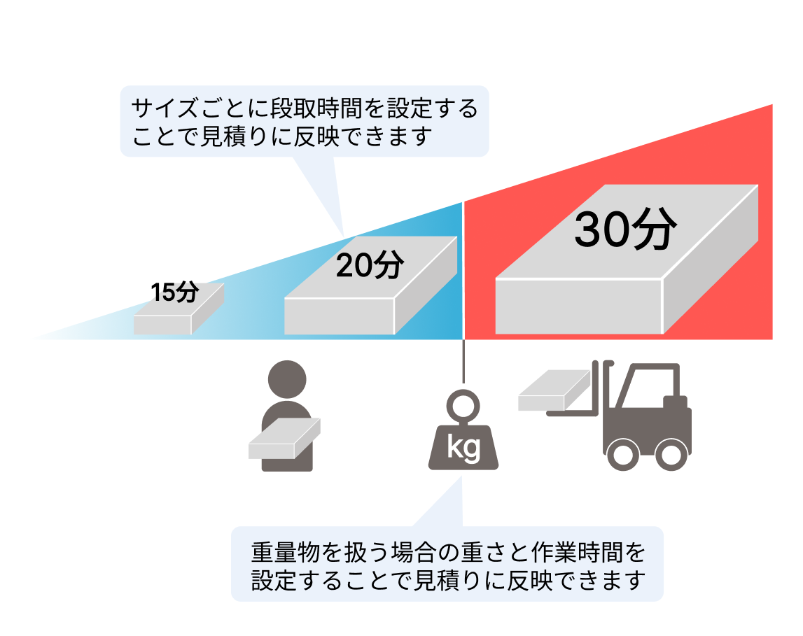 さらに、手作業での脱着が困難な重い製品は、クレーンやフォークリフトの使用を想定した重量物用の設定を新たに追加しています。これらの機能拡大により、サイズを考慮した作業内容と時間を見積りに反映させることが可能です。
